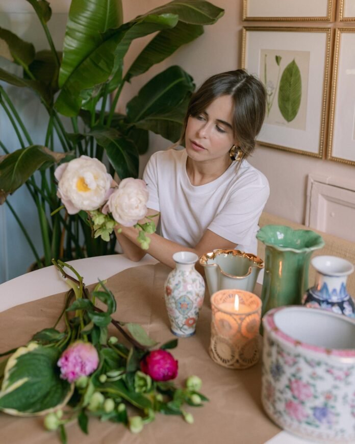 When creating a floral centerpiece, I like to pair the flowers with greenery to add fullness. It doesn’t require much effort, but the result is always stunning. Whether it’s a simple vase on the kitchen table or a more elaborate arrangement on a desk, adding fresh flowers is a quick way to transform a space.